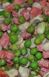 baby broad beans fresh or frozen, or use half beans and half frozen peas